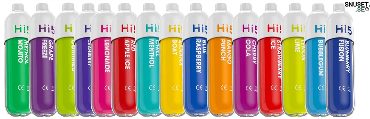Utöver den innovativa designen erbjuder Hi5 en imponerande palett av smaker. Smaksortimentet för 2024 inkluderar Blue Raspberry, Blueberry Fusion, Blueberry Cherry Cranberry och Banana Boat, Blueberry Bubblegum, Cherry Cola, Chill Menthol, Grape Freeze, Gummies, Lemon Lime, Mango Punch, Menthol Mojito, Pink Lemonade, Red Apple Ice och Strawberry Ice. Denna mångfald av smaker tillgodoser en bred publik och erbjuder en unik vape-upplevelse som kombinerar stil, smak och unikitet.