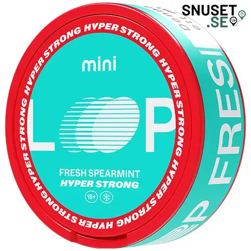 Loop Fresh Spearmint Hyper Strong Mini är ett vitt snus från Another Snus Factory med en tydlig smak av spearmint, som är lite mildare och sötare än pepparmint. Prillorna har en normal fuktighet med en jämn frisättning av smak och nikotin genom hela användningen, och ett mini format för en mjuk passform under läppen.