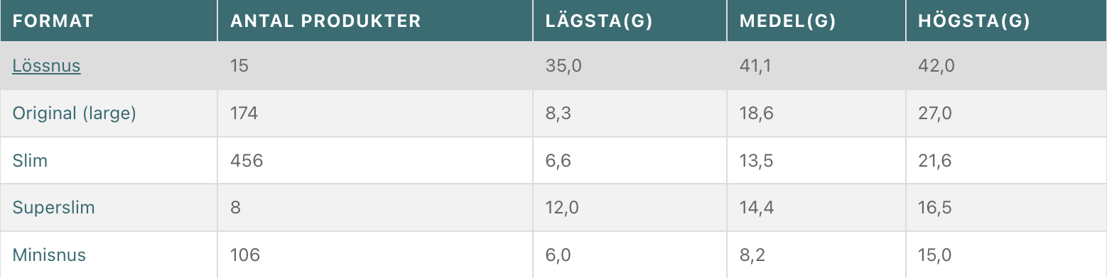 Tabellen nedan visar en sammanställning av nettovikten för olika snusformat. Nettovikten per dosa varierar beroende på format, och här visas medelvikt, lägsta och högsta vikt för varje kategori, vilket ger en tydlig bild av viktspannet inom varje format.