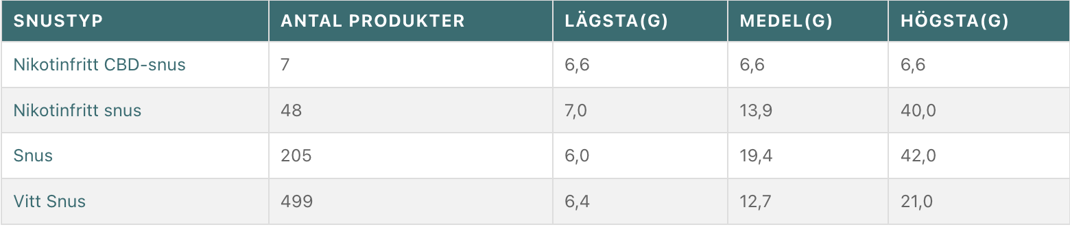Tabellen nedan visar en sammanställning av nettovikten för olika typer av snusprodukter. Nettovikten per dosa varierar beroende på snustyp, och här visas både genomsnittlig vikt, lägsta och högsta vikt för varje kategori.