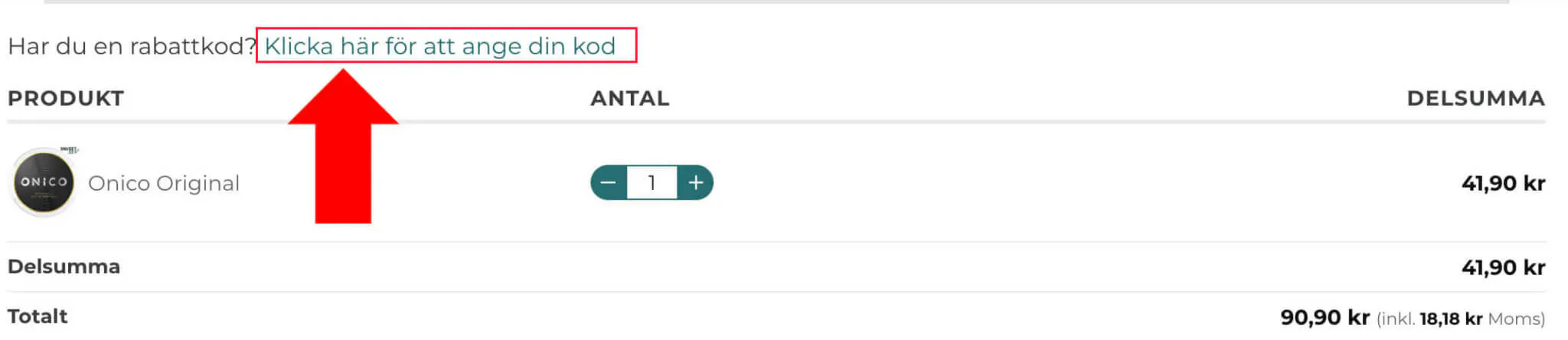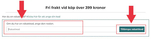 2. I kassan, hittar du texten ”Har du en rabattkod? Klicka här för att ange din kod!” över din ordertotalsumma. Klicka på denna text för att få upp ett fält där du kan klistra in eller skriva in din rabattkod. Notera att koden inte får innehålla några mellanslag i början eller slutet och att den enbart ska bestå av stora bokstäver.