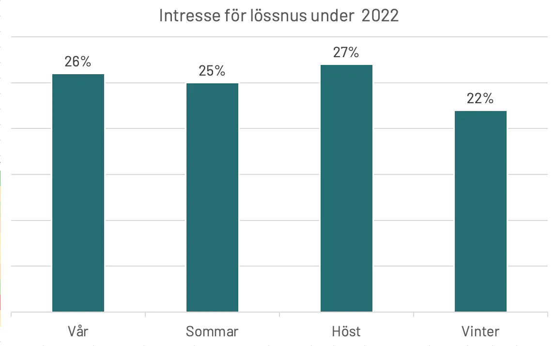 Men 2016 skedde en förändring. Sommaren blev plötsligt en toppmånad för snusintresset, med en ökning till hela 31%. Denna trend har fortsatt, och 2022 var fördelningen av intresset följande: