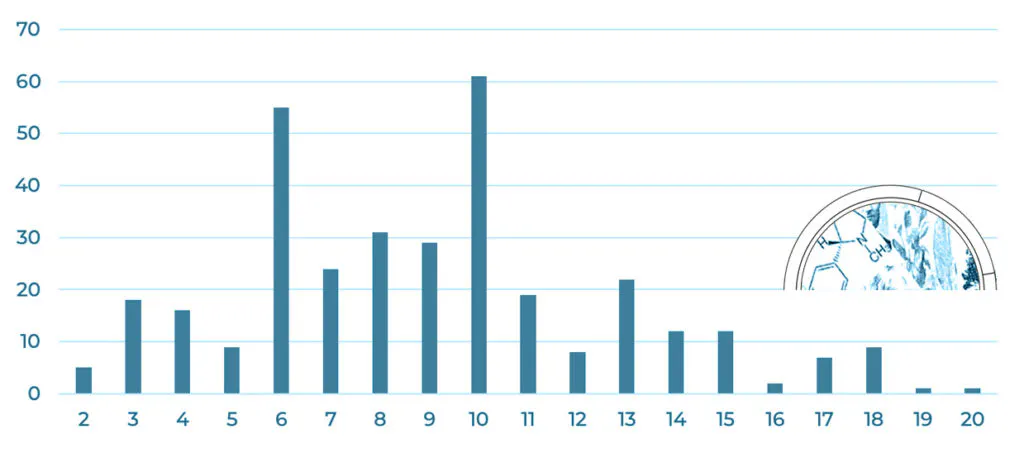 Graf: Antal snussorter per nikotinstyrka (mg/prilla)