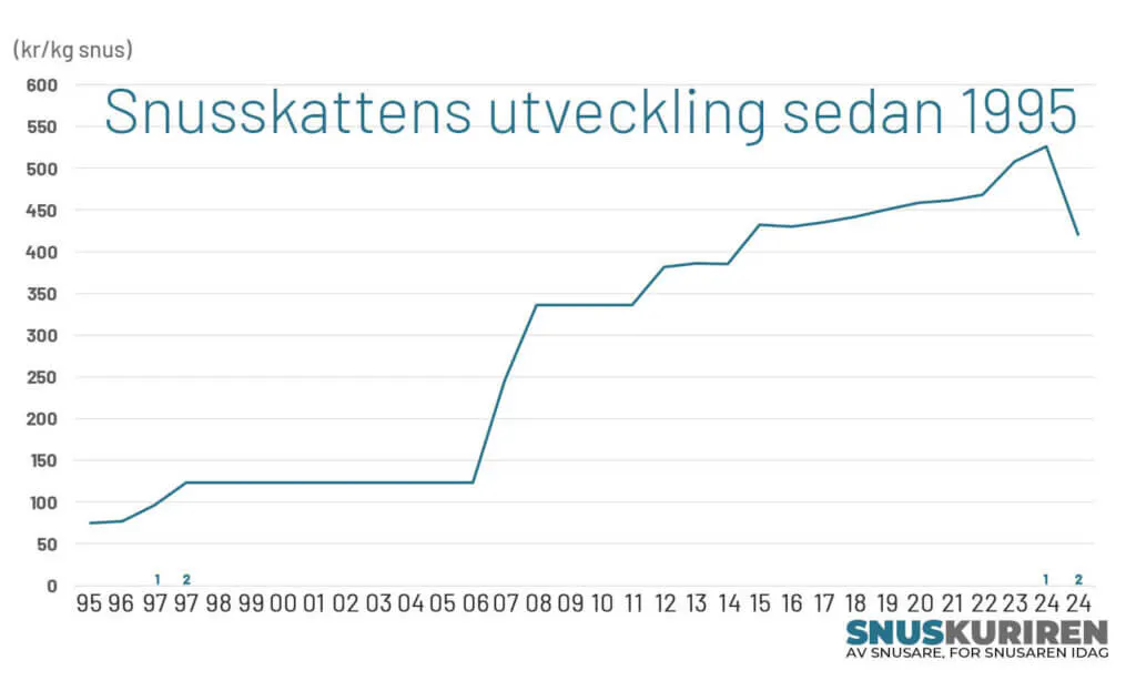 Sedan mitten på 1990-talet har skatten på snus ökat med 577%, från 75 till 508 kr per kilo snus. Nu i januari 2024 passerar vi 600% med en ökning på 601% sedan 1995, från 75 till 526 kr per kilo snus.