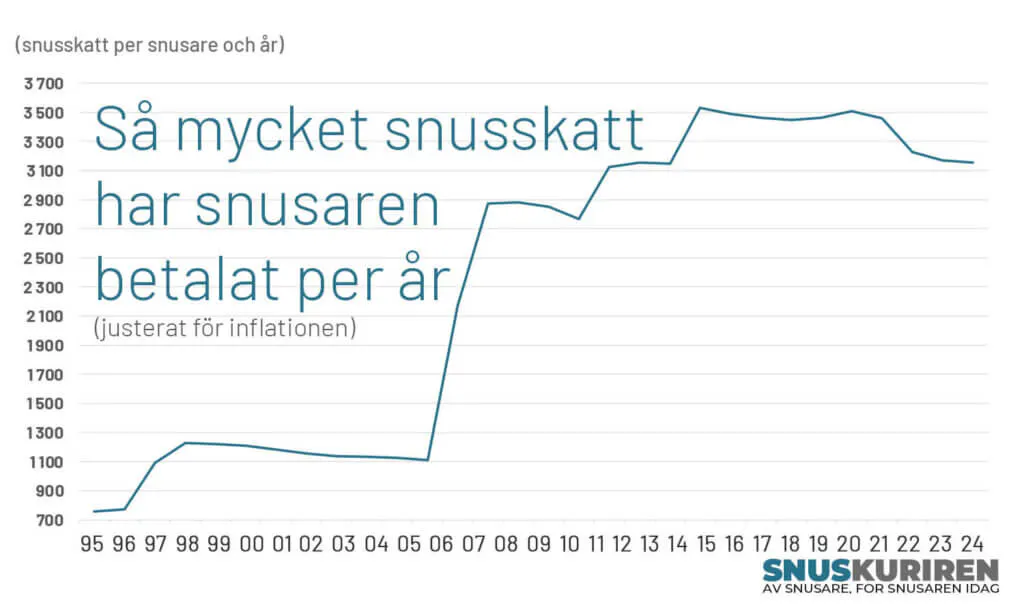 I grafen nedan ser du hur mycket snusskatt en snusare har betalat per år justerat för inflationen. Grafen har tagit hänsyn till de två tillfällen då skatteförändringar genomfördes vid annan tid än vid årsskiftet (1997 samt 2024).