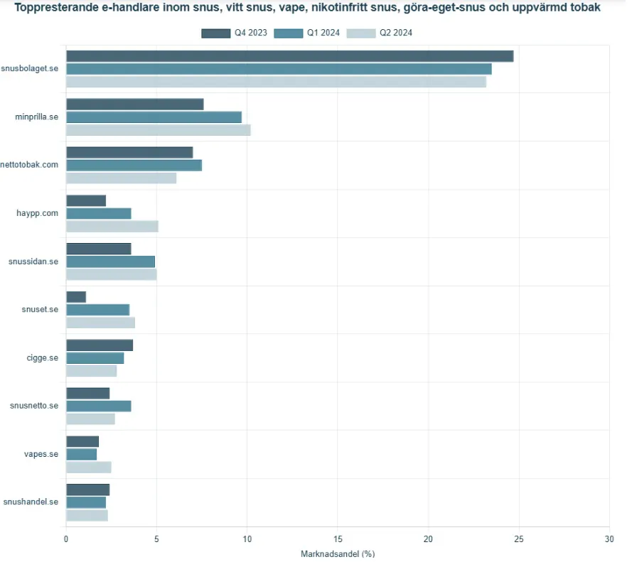 Cigge.se, som tidigare dominerade marknaden, har dock sett sin marknadsandel minska till 14,5 %, medan Vapes.se visat tecken på återhämtning med en ökning till 13,7 % efter en svacka tidigare i år.