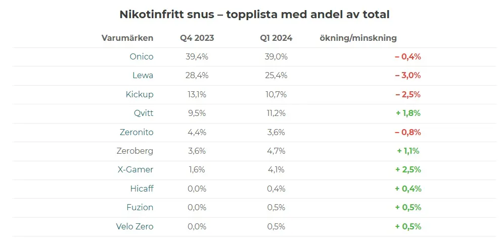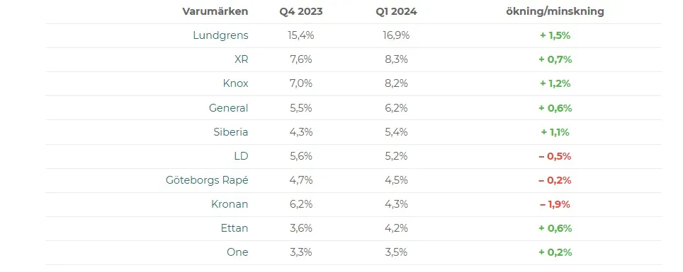 Det finns dock varumärken som inte rider på samma framgångsvåg. Kronan, LD och Göteborgs Rapé har sett sina andelar minska, med Kronan som noterar den mest anmärkningsvärda nedgången på 1,9 procentenheter.