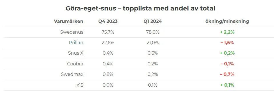 | Göra-eget-snus | 2,3% | 1,9% | – 0,4% |