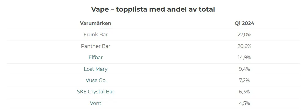 Vape – topplista med andel av total