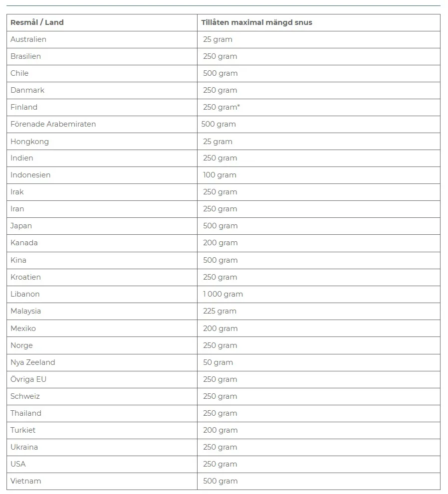 - Tabell: Tillåten mängd snus per resmål/Land