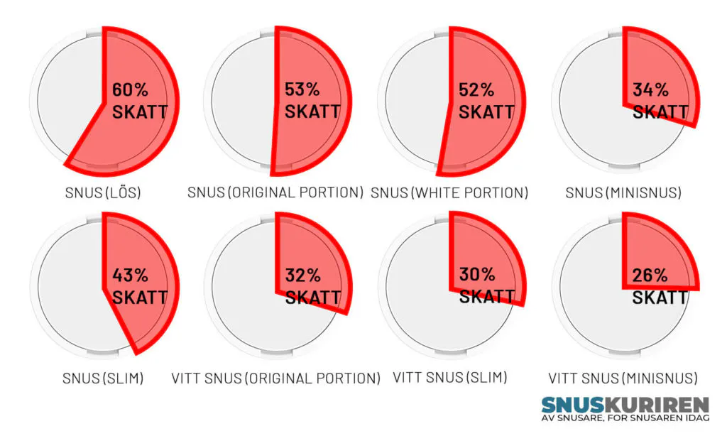Skatten på snus varierar beroende på snustyp, med exempel som 49% för standard snus och 60% för lössnus. Skatten fastställs baserat på snusets vikt, med nuvarande skattesatser på 508 kronor per kilo för vanligt snus och 200 kronor per kilo för tobaksfritt vitt snus. Snuskuriren fortsätter bevaka snuset och snusarnas rättigheter.