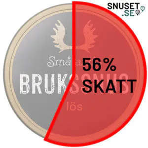 Smålands Brukssnus Lös från Skruf Snus har en total beskattning som ligger strax över 50%. 56 procent av det snusaren betalar för dosan* är skatt i någon form. 36 procent är ren snusskatt, 20 procent är moms.
