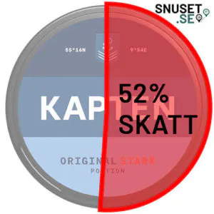 Kaptens starka portionssnus (sedan i år 2023 tillverkat av Swedish Match) har ett totalt skattetryck på 52%. 52 procent av det snusaren betalar för dosan* är alltså skatt i någon form. 32 procent är ren snusskatt, 20 procent är moms.