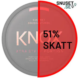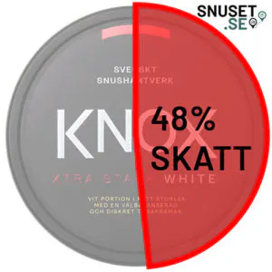 Skruf Snus starkaste vit portion Knox Extra Stark White Portionssnus består av 48% skatt. 48 procent av det snusaren betalar för dosan* är alltså skatt i någon form. 28 procent är ren snusskatt, 20 procent är moms.