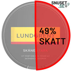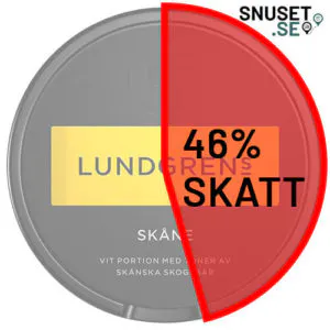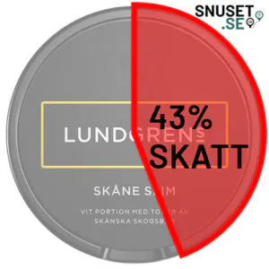 Den slimma varianten av Lundgrens Skåne, Lundgrens Skåne Slim White Portion har ett skattetryck på 43%. 23 procent är ren snusskatt, 20 procent är moms.