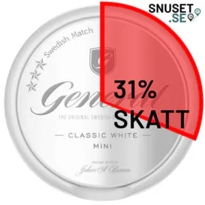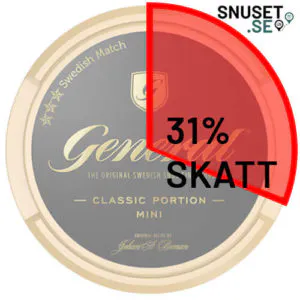 Det klassiska snuset Generals minivariant General Mini från Swedish Match har ett skattetryck på 31%. 11 procent är ren snusskatt, 20 procent är moms.