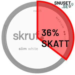 Av kostnaden för en Skruf No. 25 Original Slim White Portion utgörs 36% av någon form av skatt. 16 procent är ren snusskatt, 20 procent är moms.