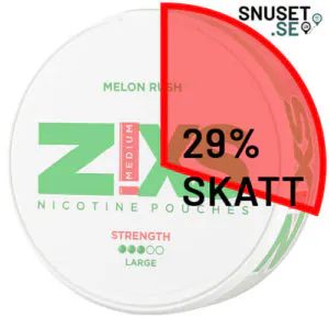 Av den summa man får betala för en dosa Zixs Melon Rush Original består 29% av skatt. 9 procent är ren snusskatt, 20 procent är moms.