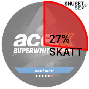 En kund som köper en dosa Ace X Cosmic Cool Mint Extra Stark Original betalar 27% i skatt. 7 procent är ren snusskatt, 20 procent är moms.