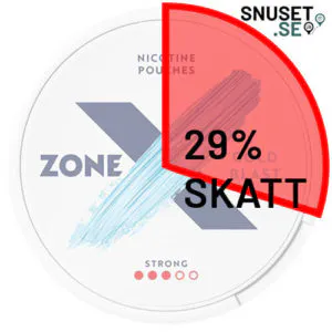 Skruf Snus helvita snus Zone X Cold Blast Stark har ett totalt skattetryck på 29%. 9 procent är ren snusskatt, 20 procent är moms.