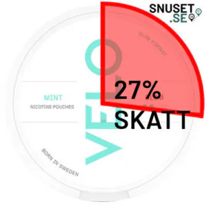 Det starka vita snuset Velo Freeze X-Strong från BAT har ett skattetryck på 27%. 7 procent är ren snusskatt, 20 procent är moms.