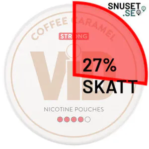 Av det pris man betalar för en dosa Vid Coffee Caramel Stark utgörs 27% av skatt. 7 procent är ren snusskatt, 20 procent är moms.
