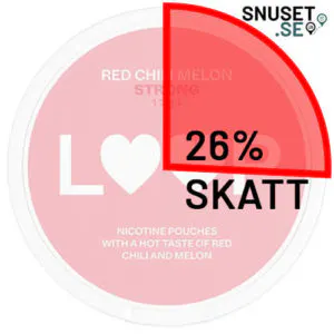 En dosa Loop Red Chili Melon kostar 19,90 kr. Av det är 26% skatt. 6 procent är ren snusskatt, 20 procent är moms.