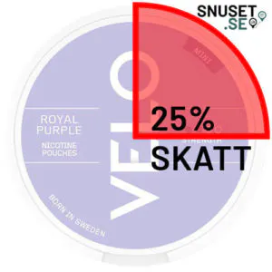 25% av det kunden betalar för en dosa Velo Royal Purple Mini går till skatt. 5 procent är ren snusskatt, 20 procent är moms.