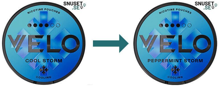 Den svala “Velo Cool Storm” tar nu namnet “Velo Peppermint Storm”. Medan dosan följer den tidigare designförändringen (lanserad under hösten 2023) får detta vita snus ett nytt namn.