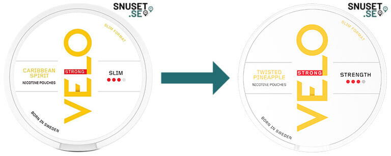Det vita snuset med smak av frukt, Velo Caribbean Spirit, får ett nytt namn: “Velo Twisted Pineapple”. Både smak och prillan form lämnas dock orörda.