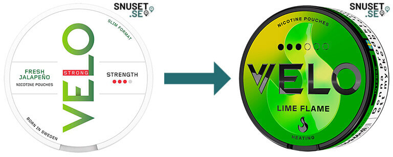 Den heta och syrliga “Velo Fresh Jalapeño” får det talande namnet “Velo Lime Flame”. Även dosan får en tydligare design som bättre illustrerar den gröna limen och hettan i chilin.