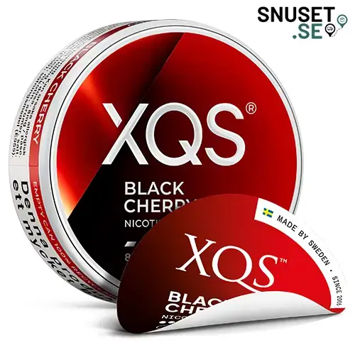 Xqs Black Cherry smakar körsbär, en smak som kombinerar djup sötma och ibland lätt syrlig smak. Med ett nikotininnehåll på 8 mg nikotin per prilla och en total nikotinhalt på 1,6%, levererar den en nikotinstyrka på normalnivå. En dosa väger 10 gram och innehåller 20 prillor.